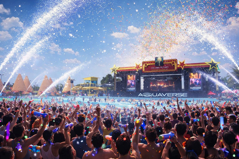 Sun-drenched water fun, foam parties, and vibrant colors under the clear blue sky.